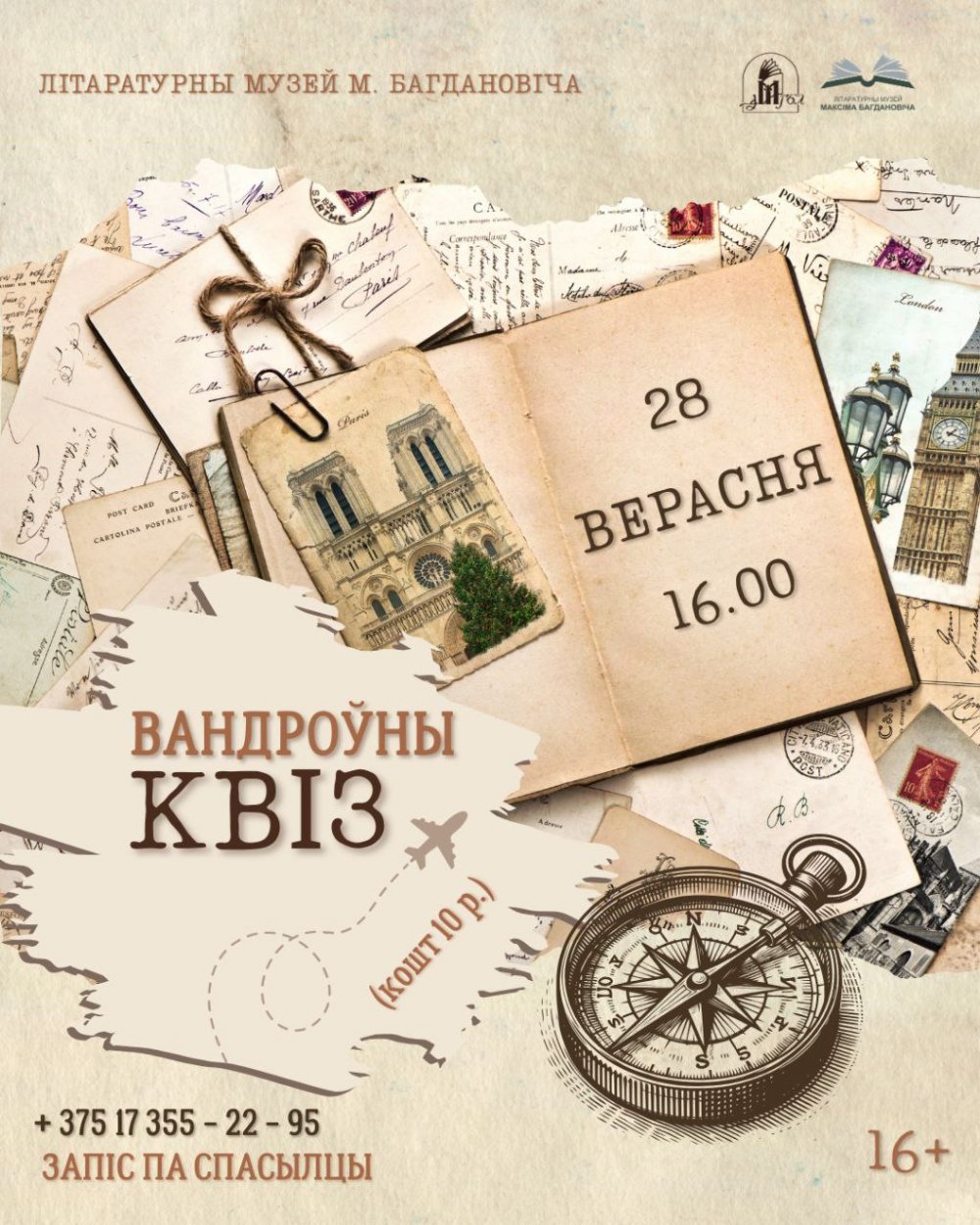 Зрабіце ж першы крок да свайго падарожжа - прыходзьце 28 верасня ў музей Максіма Багдановіча на Вандроўны КВІЗ за натхненнем, цудоўным настроем і новымі сябрамі (а можна і са сваёй камандай).
